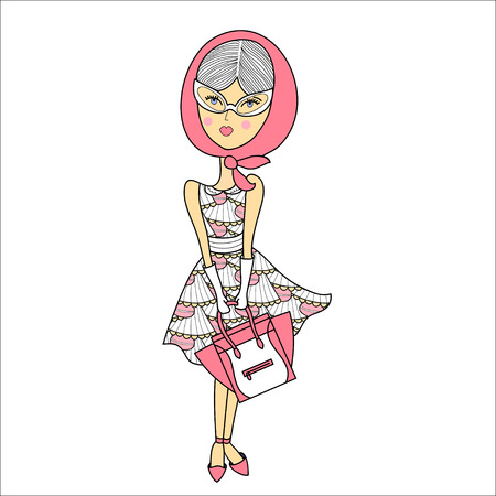 バッグとショール サングラス プリントのドレスのファッションの女の子のイラスト 白地に華やかな女性のイラスト素材 ベクタ Image
