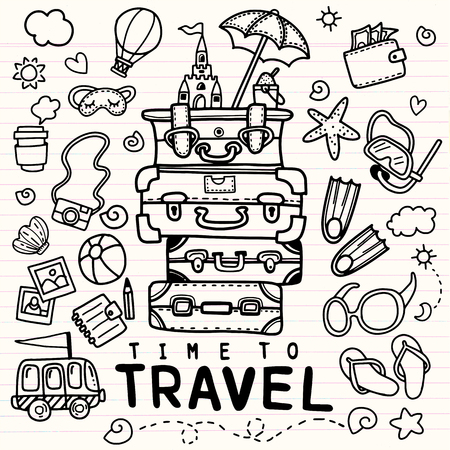 手描きの旅落書きのセット ベクトルイラスト 旅行要素と観光と夏のスケッチ バッグ バルーン フィン サングラス カメラ カクテル チケット のイラスト素材 ベクタ Image