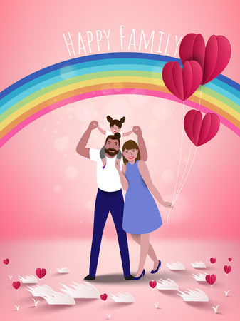 幸せな両親は子供と楽しい時間を過ごしています 心の背景に家族 紙の切り傷が刺された ベクトルのイラスト のイラスト素材 ベクタ Image