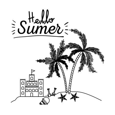 自転車とヤシの木の横にある荷物を持つビーチの風景こんにちは夏の白黒ポスター ベクトル イラストのイラスト素材 ベクタ Image