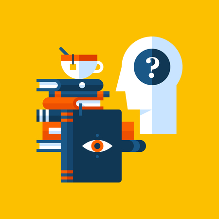 現代のフラットスタイルの心理学についてのカラフルなイラスト 黄色の背景に大学の件名アイコン 疑問符 本 紅茶のカップを持つ人間の頭 のイラスト素材 ベクタ Image