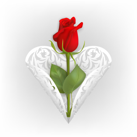 白い背景に装飾的なハートと写真のリアルな赤いバラを切り取ります 美しい赤いバラの芽が心臓に芽を出した ベクトルイラスト 聖バレンタインデーのグリーティングカード のイラスト素材 ベクタ Image