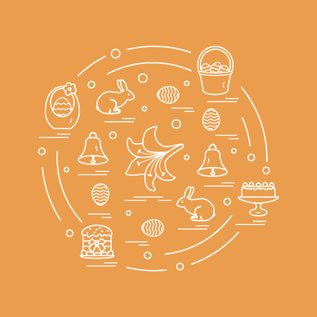 イースターは円形に配置の異なるシンボルでかわいいベクター イラスト シムネル ケーキ ユリ バスケット 卵 その他のアイコンを含みます 横断幕や ポスター印刷のデザイン のイラスト素材 ベクタ Image