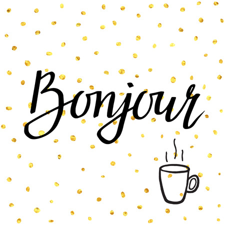 ボンジュール 挨拶 ポスター カード T シャツ プリント Web 使用のホット コーヒーのカップを持つイラストです のイラスト素材 ベクタ Image