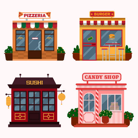 レストラン カフェ ファーストフードにある建物のイラスト イタリアのピザ アメリカのハンバーガー ショップ 日本の寿司 菓子屋 のイラスト素材 ベクタ Image