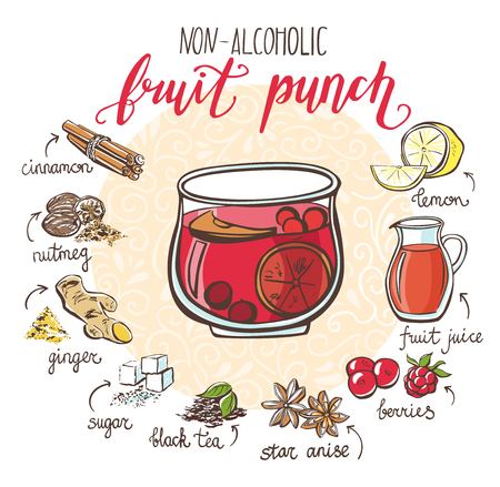 フルーツ パンチ ホットド リンクとその成分円組成と手書きのベクトル図です おいしいドリンク レシピ カード ポスターやメニューのデザインを手描き落書きカップのイラスト素材 ベクタ Image