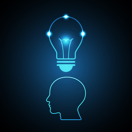 技術デジタル未来創造的なアイデアの抽象的な背景 人間頭フロント ビュー内明るい青色の電球ベクトル イラスト のイラスト素材 ベクタ Image