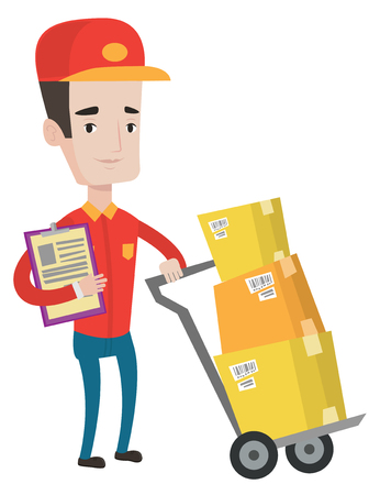 若い配達郵便屋さんトロリーのボックス 段ボール箱と台車を押して配達郵便配達 配達郵便小包を提供します ベクトル フラットなデザイン イラスト は 白い背景で隔離 のイラスト素材 ベクタ Image 3434