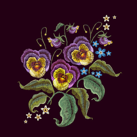 スミレの花の刺繍 クラシック刺繍シームレスな黒地に紫の美しい花 服のおしゃれなテンプレート デザインのイラスト素材 ベクタ Image