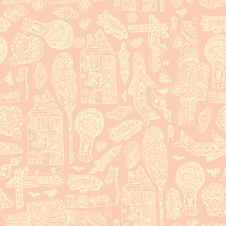 落書き手描きの町シームレスなパターン パステル抽象的な壁紙 かわいいデザインのベクトルイラスト 車 家 飛行機 風船 ロケット のイラスト素材 ベクタ Image