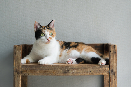 かわいい三毛猫ねこネコ猫が横たわっていると 古い木の棚で探して の写真素材 画像素材 Image 5405