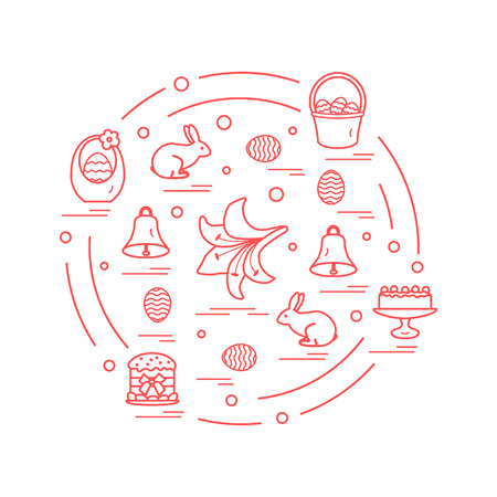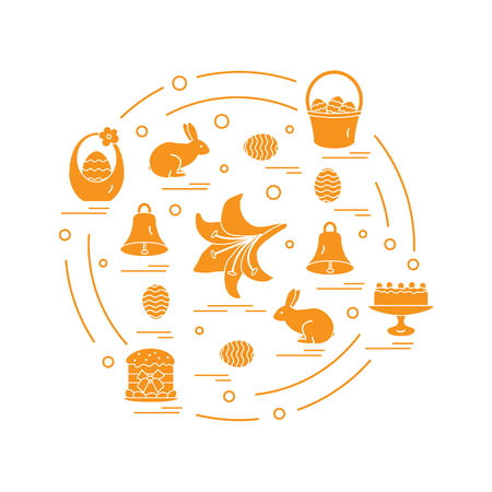 イースターは円形に配置の異なるシンボルでかわいいベクター イラスト シムネル ケーキ ユリ バスケット 卵 その他のアイコンを含みます 横断幕やポスター印刷のデザイン のイラスト素材 ベクタ Image
