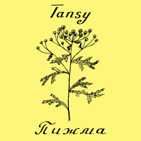 タンジー手描きスケッチ ボタニカル イラスト ベクトル描画します メディカル ハーブ 英語とロシア語の文字のイラスト素材 ベクタ Image