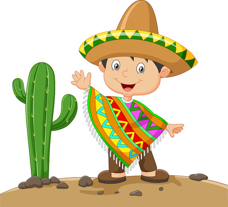 サボテン 自然の背景にメキシコのドレスを着て漫画少年のイラストのイラスト素材 ベクタ Image