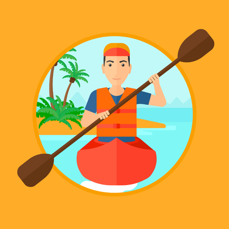 海でカヤックに乗ってスポーツマン カヤックで旅行する若い人 男性のカヤッカー パドリングします カヌーを漕ぐ人 ベクター背景に分離されたサークルでフラットなデザイン イラスト のイラスト素材 ベクタ Image
