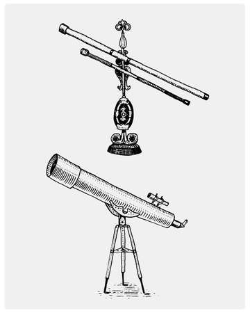 天体望遠鏡は スケッチや木で刻まれた ビンテージの手書きのカット スタイル 古いレトロな Scinetific 装置を探索し 発見を探してのイラスト素材 ベクタ Image