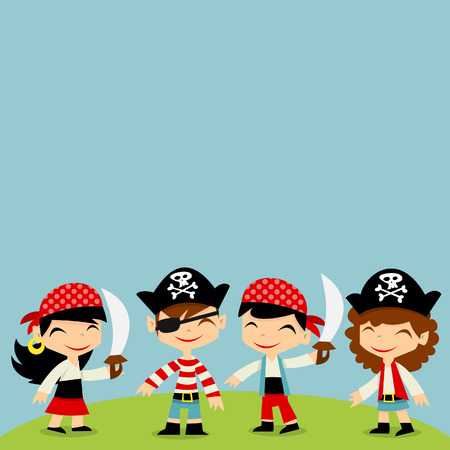 コピー領域の背景として空の島に立っている 4 人の小さな海賊とレトロな海賊アドベンチャー テーマのイラスト のイラスト素材 ベクタ Image
