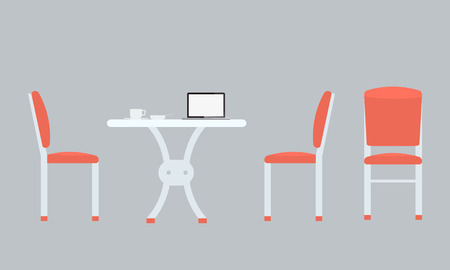 テーブル椅子アイコン 正面図と側面図が付いている椅子 一杯のコーヒーとテーブルの上のノート フラットな色のスタイルでベクトルを示します 純色の背景と分離されました のイラスト素材 ベクタ Image
